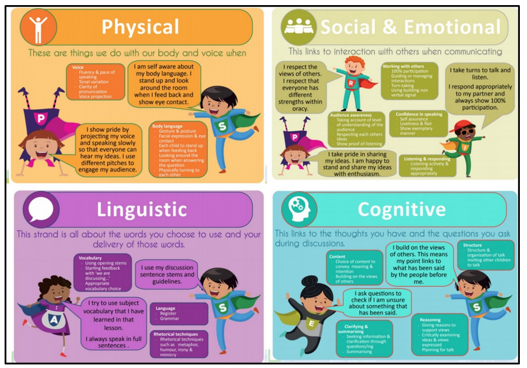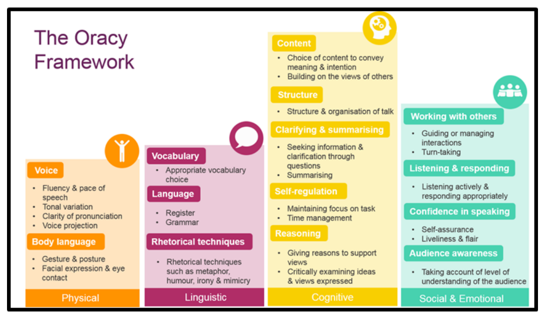 We use the Oracy Framework developed by the University of Cambridge and Voice 21 to support progression. This identifies four key strands of effective communication: